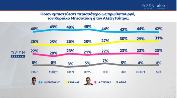 Στο ερώτημα «Κυριάκος Μητσοτάκης ή Αλέξης Τσίπρα, ποιον εμπιστεύονται οι πολίτες», ο Πρωθυπουργός προηγείται με 42% έναντι 23% του επικεφαλής της Αξιωματικής Αντιπολίτευσης. Το 31% απαντά κανέναν από τους δύο, ενώ υπάρχει και το 4% στο «δεν ξέρω, δεν απαντώ».