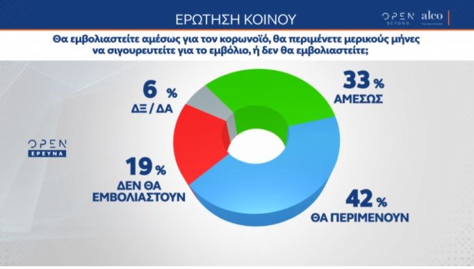 Εξαιρετικό ενδιαφέρον, όμως, παρουσιάζουν και οι απαντήσεις στην ερώτηση «Θα εμβολιαστείτε αμέσως για τον κορονοϊό, θα περιμένετε μερικούς μήνες να σιγουρευτείτε για το εμβόλιο ή δεν θα εμβολιαστείτε;». Το 33% απαντά ότι θα εμβολιαστεί αμέσως, το 42% ότι θα περιμένουν, το 19% δηλώνει πως δεν θα εμβολιαστεί, ενώ 6% είναι στο «δεν ξέρω, δεν απαντώ».