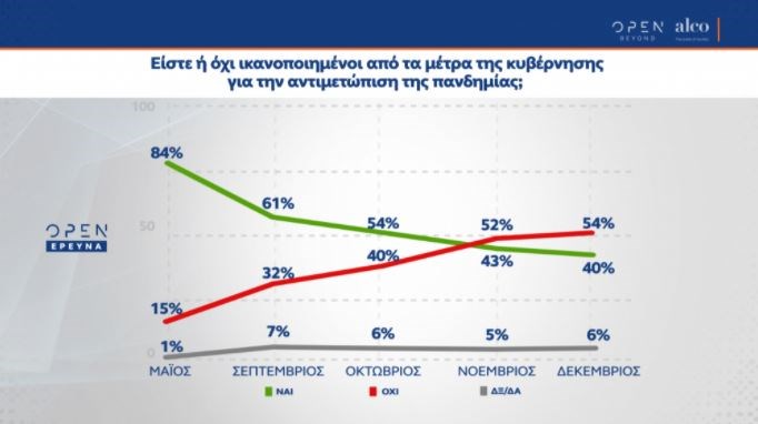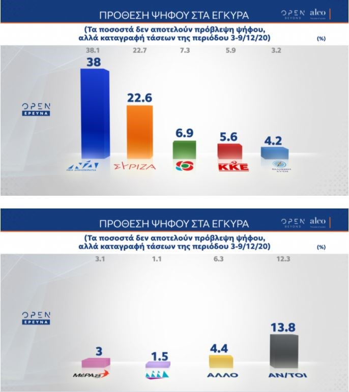 Εξαιρετικό ενδιαφέρον παρουσιάζουν τα ευρήματα της δημοσκόπησης της Alco για λογαριασμό του κεντρικού δελτίου ειδήσεων του Open. Τι πιστεύουν οι πολίτες για τo εμβόλιο του κορονοϊού και κατά πόσο θα εμπιστεύονταν να το κάνουν αμέσως μόλις έρθει στη χώρα μας, σε ποιον βαθμό είναι ικανοποιημένοι από τα μέτρα της κυβέρνησης για την αντιμετώπιση της πανδημίας αλλά και ποιον εμπιστεύονται περισσότερο ως πρωθυπουργό, τον Κυριάκο Μητσοτάκη ή τον Αλέξη Τσίπρα είναι μερικά από τα ερώτημα της δημοσκόπησης.