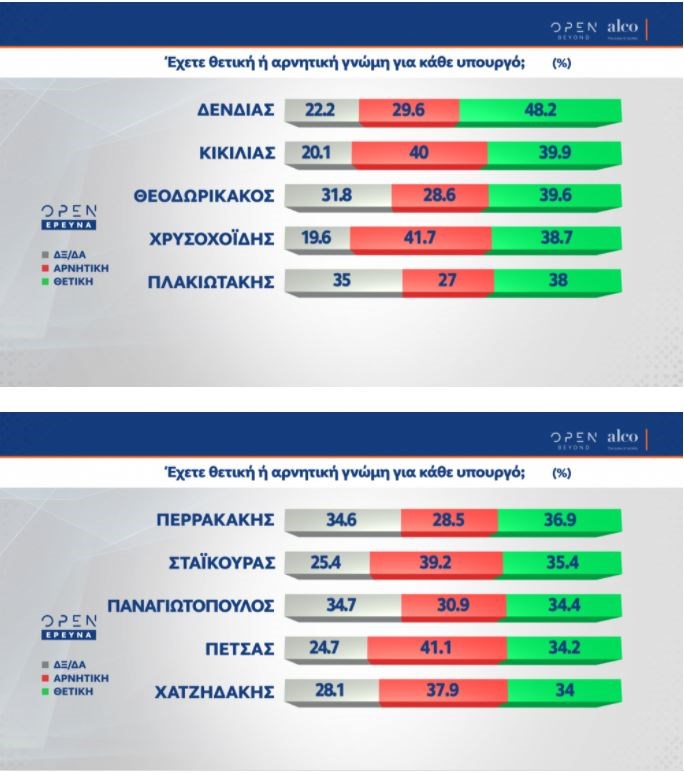 Ας πάρουμε, όμως, τα πράγματα από την αρχή, στην πρόθεση ψήφου επί των έγκυρων η ΝΔ συγκεντρώνει 38% έναντι 22,6% του ΣΥΡΙΖΑ. Στην 3η θέση είναι το ΚΙΝΑΛ με 6,9%, ακολουθεί το ΚΚΕ με 5,6%, η Ελληνική Λύση με 4,2%, ενώ το MέΡΑ25 είναι στο όριο του 3,00%. Σε ό,τι αφορά τους υπουργούς, ο Νίκος Δένδιας είναι στην κορυφή με 482% των πολιτών να έχουν θετική γνώμη, ακολουθεί ο υπουργός Υγείας Βασίλης Κικίλιας με 39,9%, ενώ την τριάδα κλείνει ο Τάκης Θεοδωρικάκος με 39,6%.