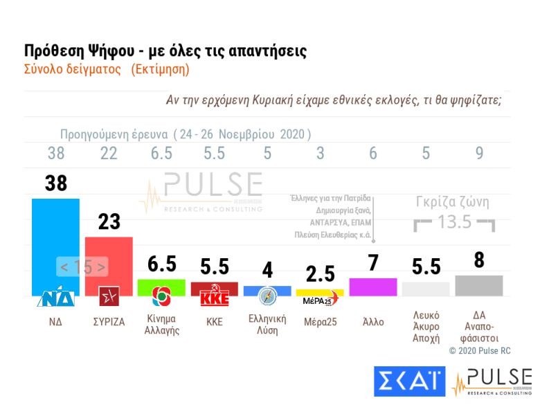 Στην πρόθεση ψήφου η Νέα Δημοκρατία συγκεντρώνει ποσοστό 38%, έναντι 23% του ΣΥΡΙΖΑ. Ακολουθούν το ΚΙΝΑΛ με 6,5%, το ΚΚΕ 5,5%, η Ελληνική Λύση με 4%, το ΜέΡΑ25 με 2,5%, άλλο κόμμα 7%, λευκό/άκυρο/αποχή το 5,5% και το 8% ΔΑ/αναποφάσιστοι.