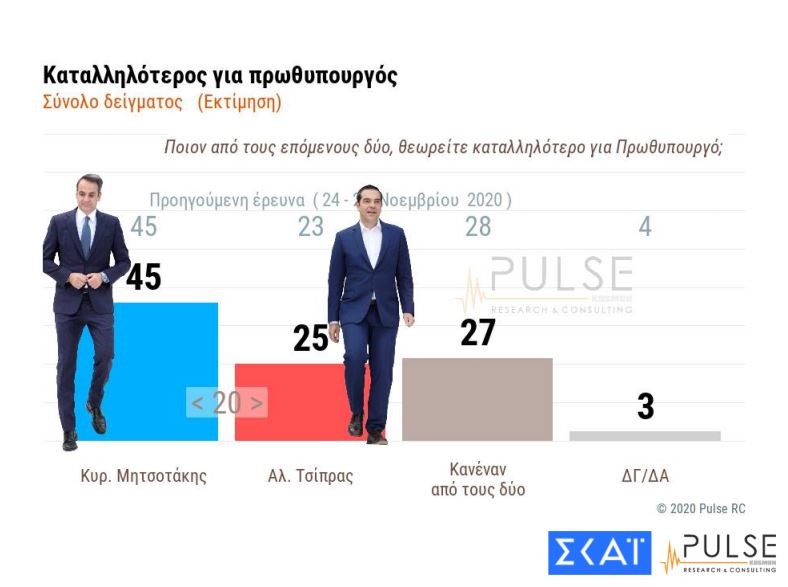 Στην ίδια δημοσκόπηση καταλληλότερος για πρωθυπουργός εμφανίζεται ο Κυριάκος Μητσοτάκης με ποσοστό 45%. Ο Αλέξης Τσίπρας συγκεντρώνει το 25%, ενώ «κανέναν από τους δύο» απαντά το 27% με το «Δεν γνωρίζω/δεν απαντώ» να είναι στο 3%.