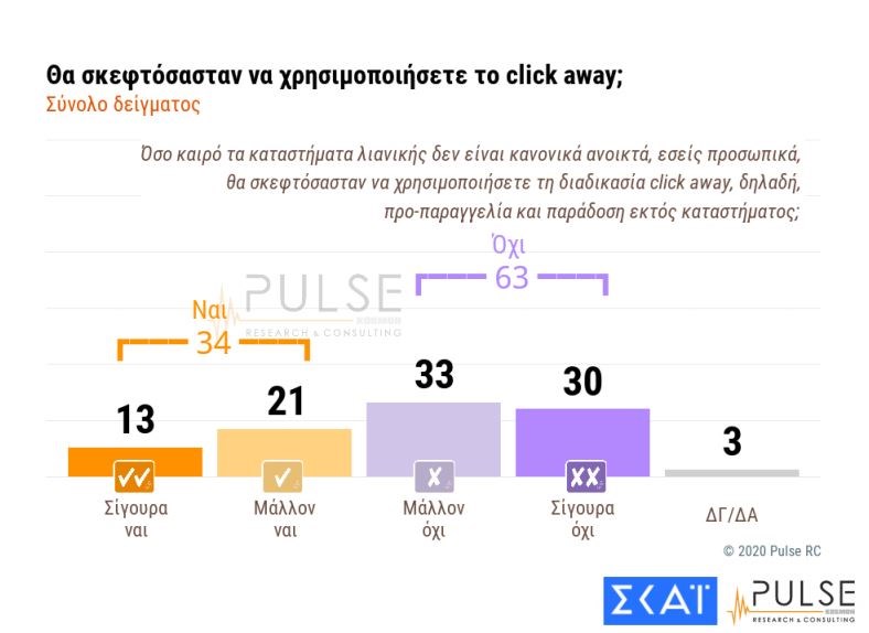 Σε άλλη ερώτηση, σχετικά με το click away, που έχει μπει εδώ και λίγες ημέρες στη ζωή μας, το 34% απαντά πως “σίγουρα ναι” και “μάλλον ναι” θα σκεφτόταν να το χρησιμοποιήσει, ενώ το 63% απαντά πως “μάλλον όχι” και “σίγουρα όχι”. Το 3% απαντά ΔΓ/ΔΑ.