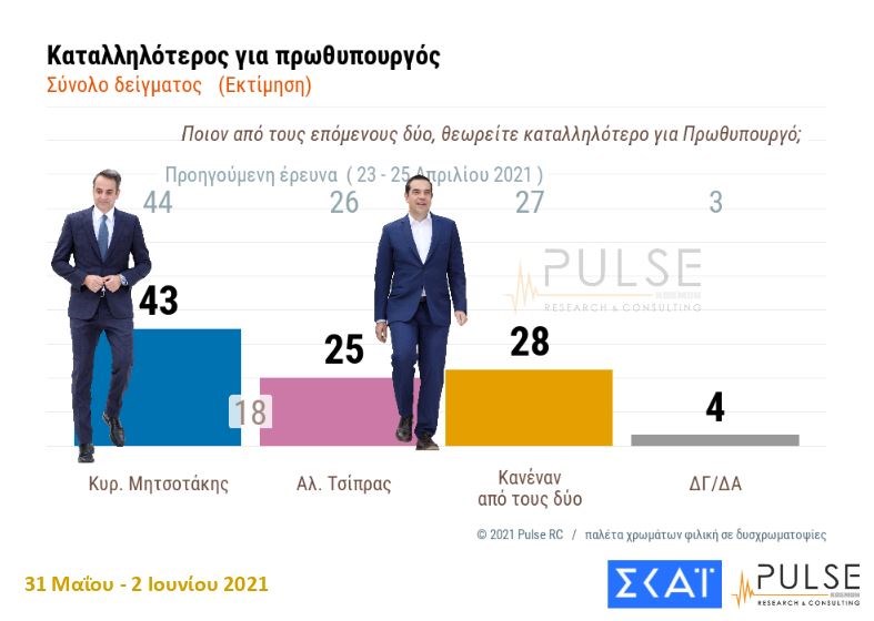 Στο ερώτημα ποιος είναι καταλληλότερος για πρωθυπουργός, ο Κυριάκος Μητσοτάκης προηγείται με 18 μονάδες του Αλέξη Τσίπρα, συγκεντρώνοντας το 43% έναντι 25% του προέδρου της αξιωματικής αντιπολίτευσης. Αντίθετα, το ποσοστό των ερωτηθέντων που απάντησαν «Κανένας από τους δύο» ανέρχεται στο 28%.