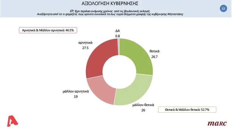Στο ερώτημα πώς αξιολογούν οι πολίτες την κυβέρνηση ανεξάρτητα από το τι ψηφίζουν, το 52,7% απαντά θετικά (26,7%) ή μάλλον θετικά (26%) και το 46,5% αρνητικά (27,5%) ή μάλλον αρνητικά (19%), ενώ το 0,8% δεν απαντά.
