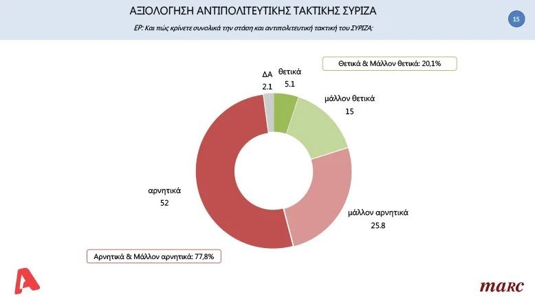 Όσο για το πώς κρίνουν την Αξιωματική Αντιπολίτευση, το 77,8% απαντά αρνητικά (52%) ή μάλλον αρνητικά (25,8%) και το 20,1% θετικά (5,1%) ή μάλλον Θετικά (15%), ενώ το 2,1% δεν απαντά.