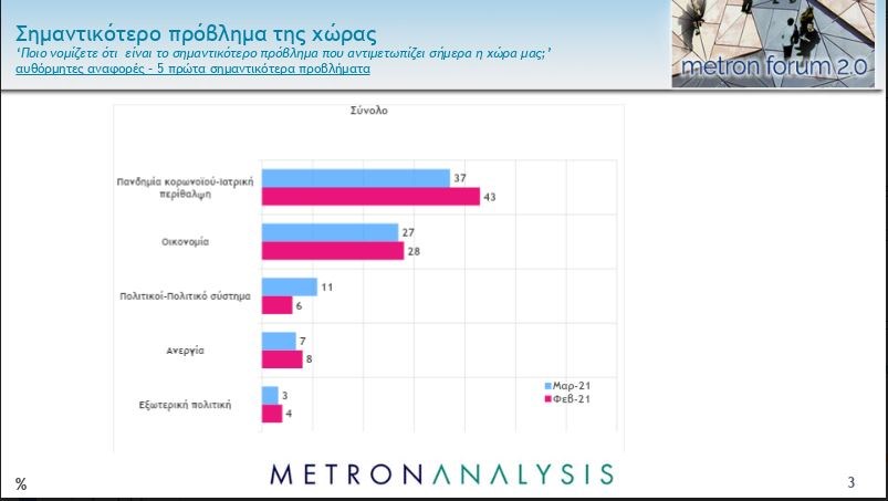 Ως πιο σημαντικό πρόβλημα για τη χώρα παραμένει η πανδημία και η ιατρική περίθαλψη με 37%, όμως πριν από ένα μήνα ήταν στο 45%. Στη δεύτερη θέση βρίσκεται η οικονομία με 27% ενώ ακολουθεί το πολιτικό σύστημα με 11%, από 6% τον Φεβρουάριο, κάτι που δείχνει αύξηση των πολιτών που δεν εμπιστεύονται τους πολιτικούς. Ακολουθούν η ανεργία με 7% και η εξωτερική πολιτική με 3%.