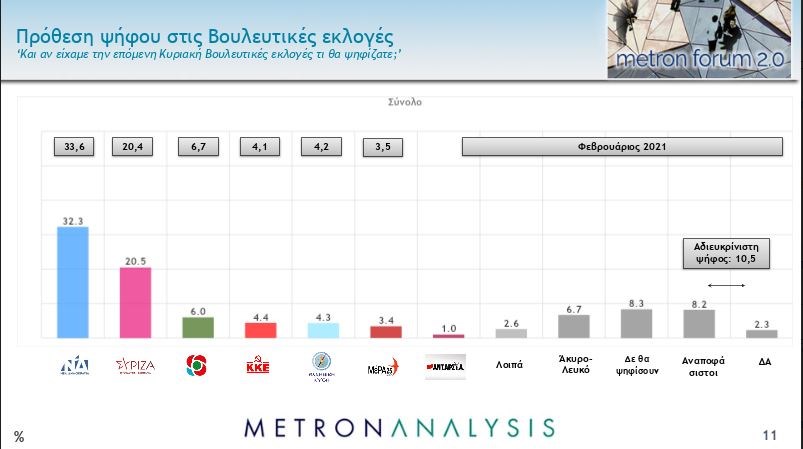 Διψήφια διαφορά έναντι του ΣΥΡΙΖΑ με το ποσοστό της, ωστόσο, να είναι μειωμένο κατά 1,3% σε σχέση με τον Φεβρουάριο, καταγράφει η Νέα Δημοκρατία σε δημοσκόπηση της ης Metron Analysis που παρουσιάστηκε στο κεντρικό δελτίο ειδήσεων του MEGA.