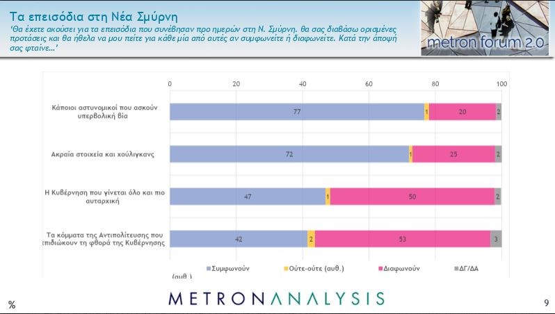 Με αφορμή τα επεισόδια στη Νέα Σμύρνη, το 77% συμφωνεί ότι κάποιοι αστυνομικοί ασκούν υπερβολική βία και μόλις 20% διαφωνούν, 1% είναι στο «ούτε-ούτε», ενώ 2% κινείται στο «δεν γνωρίζω/δεν απαντώ». Επίσης, 72% αναφέρει ότι φταίνε ακραία στοιχεία και χούλιγκαν, το 25% διαφωνεί μ’ αυτή την άποψη, ενώ το 1 κινείται στο «ούτε-ούτε» και στο 2% στο «δεν γνωρίζω/δεν απαντώ».