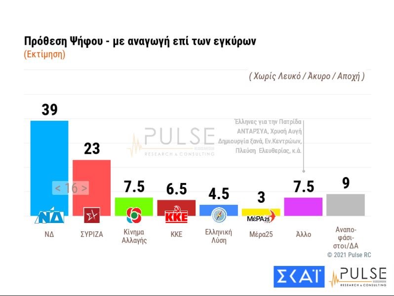 Στην πρόθεση ψήφου με αναγωγή επί των έγκυρων, η ΝΔ συγκεντρώνει 39% έναντι 23% του ΣΥΡΙΖΑ. Στην 3η θέση βρίσκεται το ΚΙΝΑΛ με 7,5%, ακολουθεί το ΚΚΕ με 6,5%, τη Ελληνική Λύση με 4,5%, ενώ το ΜέΡΑ25 είναι στο όριο του 3%. Το «Άλλο κόμμα» συγκεντρώνει 7,5%, ενώ στο 9% είναι οι «αναποφάσιστοι και οι δεν απαντώ».
