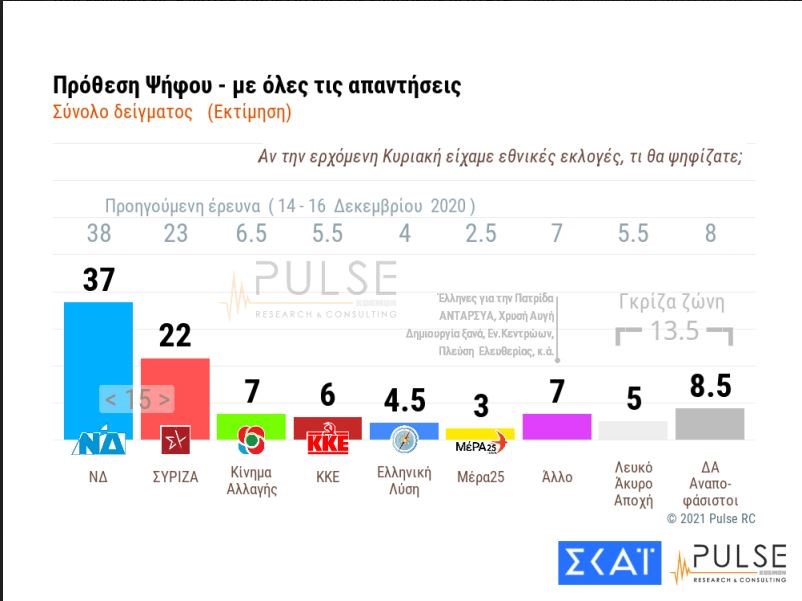 Στην πρόθεση ψήφου με όλες τις απαντήσεις η Νέα Δημοκρατία συγκεντρώνει 37% (έναντι 38% στην προηγούμενη δημοσκόπηση) έναντι 22% (από 23%) του ΣΥΡΙΖΑ με τη διαφορά να φτάνει στις 15 ποσοστιαίες μονάδες. Το Κίνημα Αλλαγής σημειώνει 7%, το ΚΚΕ 6%, η Ελληνική Λύση 4,5% και το ΜέΡΑ 25 3%. Άλλο κόμμα δηλώνει ότι θα ψηφίσει το 7% των ερωτηθέντων, 5% δηλώνει λευκό άκυρο ή αποχή, ενώ 8,5% δηλώνουν αναποφάσιστοι.