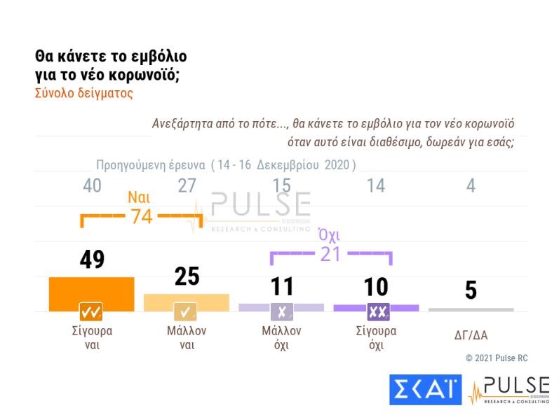 Στο ερώτημα “θα κάνετε το εμβόλιο για τον κορονοϊό”, το 74% απαντά «σίγουρα ναι, μάλλον ναι”, το 21% είναι στο «μάλλον όχι, σίγουρα όχι”, ενώ 5% είναι στο “δεν γνωρίζω/δεν απαντώ”.