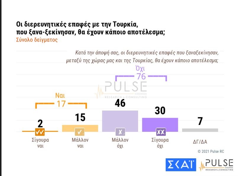 Αναφορικά με την επανεκκίνηση των διερευνητικών επαφών, και το εάν θα έχουν κάποιο αποτέλεσμα, το 17% δηλώνει σίγουρα ναι (2%) και μάλλον ναι (15%), ενώ το 76% απαντά μάλλον όχι (46%) και σίγουρα όχι (30%).