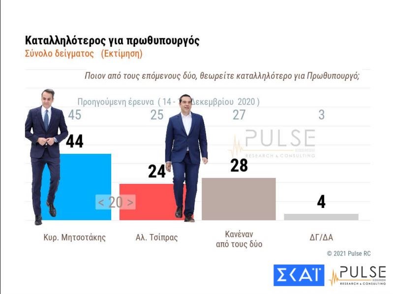 Στο ερώτημα ποιος είναι καταλληλότερος για πρωθυπουργός, ο Κυριάκος Μητσοτάκης συγκεντρώνει 44%, ο «κανένας από τους δύο»« είναι στο 28%, ο Αλέκης Τσίπρας είναι στο 24%, ενώ στο 4% είναι το «δεν γνωρίζω/δεν απαντώ».
