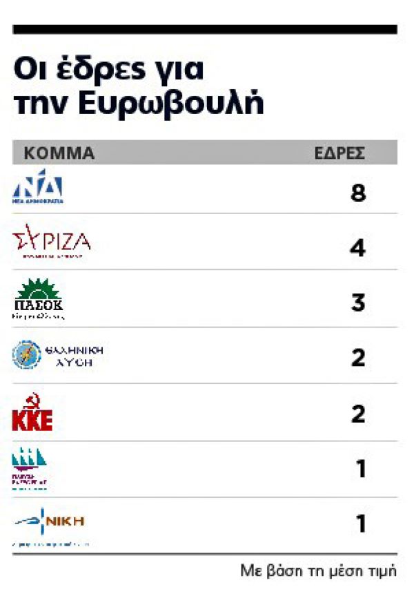 Στην κατανομή εδρών, η Νέα Δημοκρατία φαίνεται να στέλνει στην Ευρωβουλή 8 βουλευτές, ο ΣΥΡΙΖΑ 4 το ΠΑΣΟΚ 3,η Ελληνική Λύση 2, το ΚΚΕ 2, ενώ η Πλεύση Ελευθερίας και η ΝΙΚΗ φαίνεται ότι εκλέγουν από έναν βουλευτή.