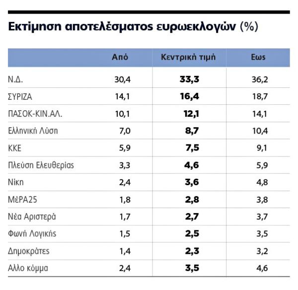 Στην εκτίμηση αποτελέσματος η ΝΔ παραμένει πρώτη με 33,3% ο ΣΥΡΙΖΑ δεύτερος με 16,4%, το ΠΑΣΟΚ τρίτο με 12,1%, η Ελληνική Λύση έρχεται 4η με 8,7% και το ΚΚΕ πέμπτο, με 7,5%. Ακολουθούν η Πλεύση Ελευθερίας με 4,6%, η ΝΙΚΗ με 3,6% και το ΜΕΡΑ 25  με 2,8%.