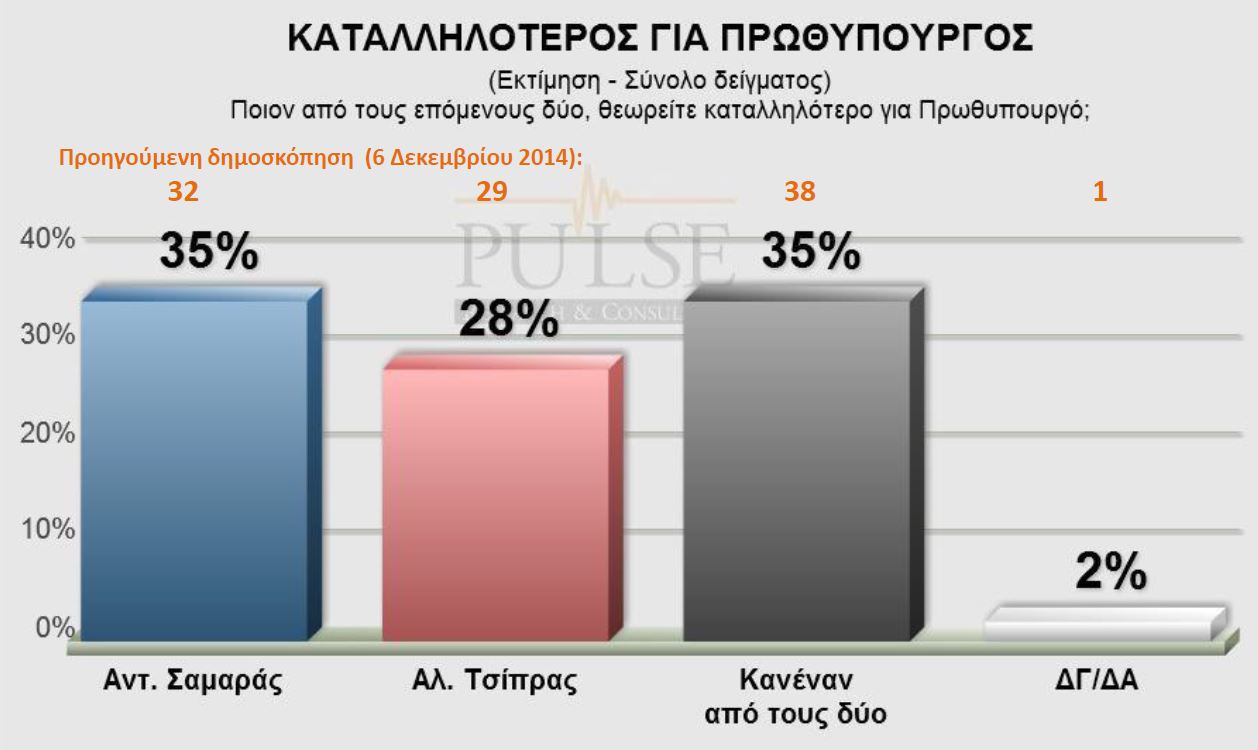 Στην ερώτηση «ποιόν από τους επόμενους δύο, θεωρείτε καταλληλότερο για πρωθυπουργό;», τον Αντώνη Σαμαρά επιλέγει το 35% και τον Αλέξη Τσίπρα το 28%, ενώ το 35% απαντάει «κανέναν από τους δύο». Ένα 2% δεν απάντησε.