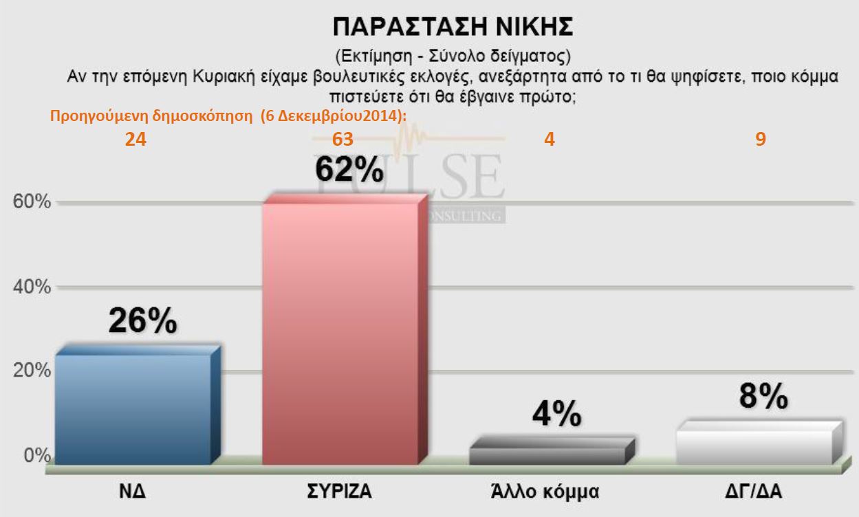 Σε ερώτημα για την παράσταση νίκης («αν την επόμενη Κυριακή είχαμε εκλογές, ανεξάρτητα από το τι θα ψηφίσετε, ποιό κόμμα πιστεύετε ότι θα έβγαινε πρώτο») το 62% απάντησε ο ΣΥΡΙΖΑ, το 26% η ΝΔ, και 4% άλλο κόμμα. Ένα 8% του δείγματος δεν απάντησε.