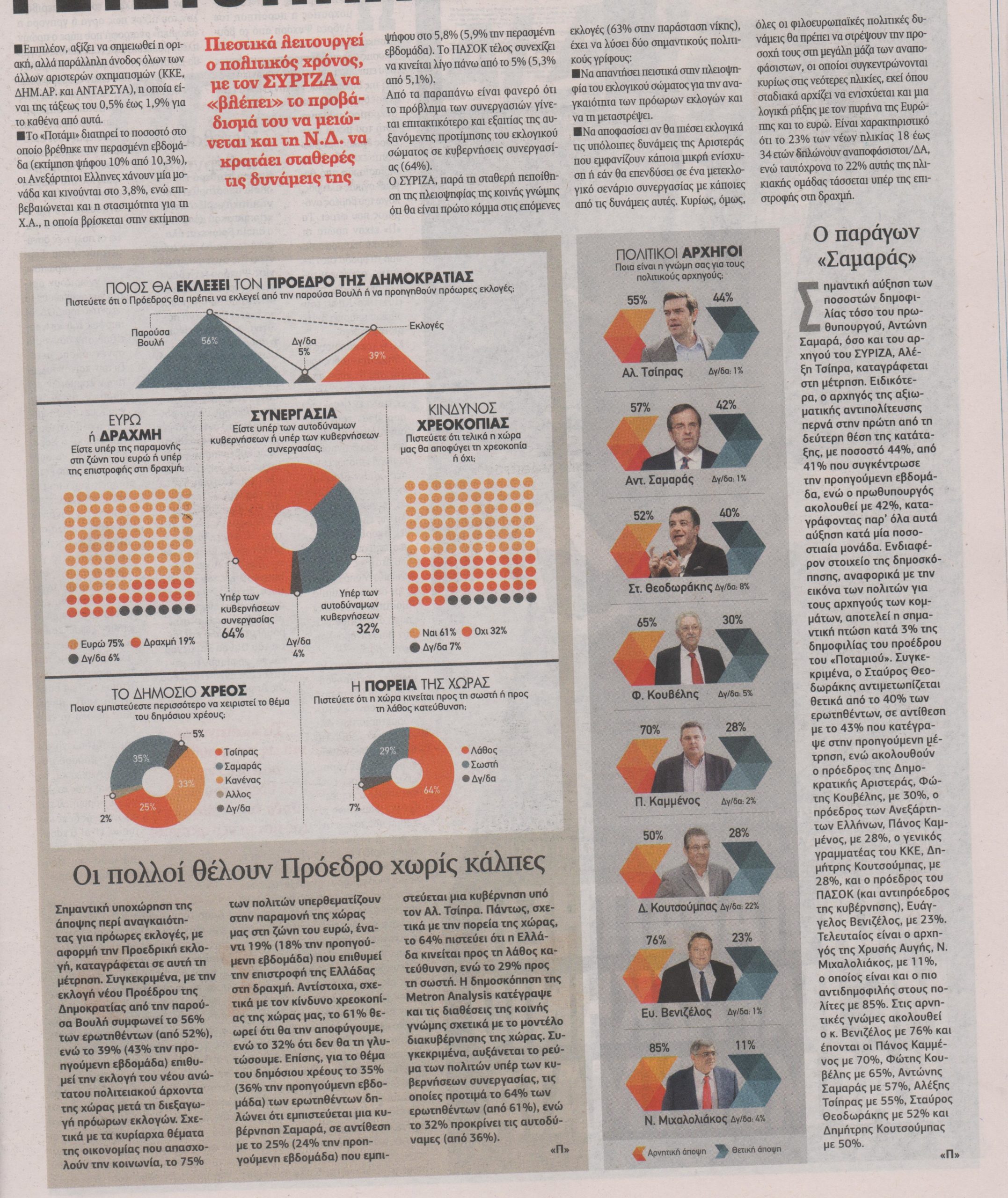 Στην εκτίμηση ψήφου, ο ΣΥΡΙΖΑ προηγείται με 31,3% (από 32,6% την προηγούμενη εβδομάδα) και ακολουθούν η ΝΔ με 26,5%, το «Ποτάμι» με 10%, το ΚΚΕ με 6,1%, η Χρυσή Αυγή με 5,8%, το ΠΑΣΟΚ με 5,3%, οι Ανεξάρτητοι Έλληνες με 3,8%, η ΑΝΤΑΡΣΥΑ με 2,2% και η Δημοκρατική Αριστερά με 1,6%.
