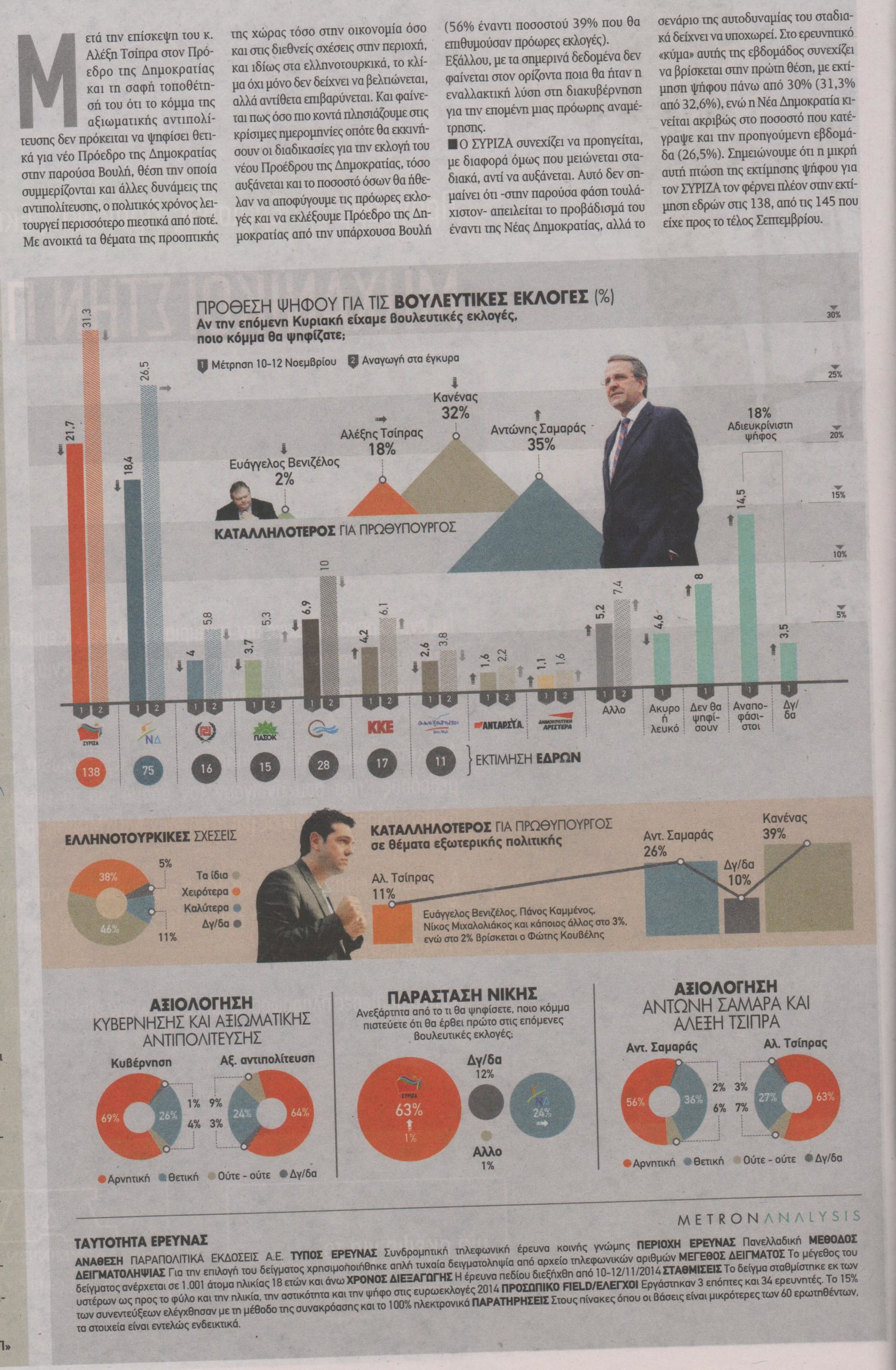 Παράλληλα, ο Πρωθυπουργός , Αντώνης Σαμαράς, προηγείται στην αξιολόγηση των πολιτών με 36% έναντι 27% του Αλέξη Τσίπρα. Στο ερώτημα «ποιος πολιτικός αρχηγός είναι καταλληλότερος να χειριστεί θέματα εξωτερικής πολιτικής;», ο κ. Σαμαράς προηγείται του Αλέξη Τσίπρα με 26% έναντι 11% του δεύτερου.