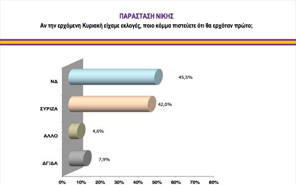 Τα ποσοστά που συγκεντρώνουν τα κόμματα στην πρόθεση ψήφου έχουν ως εξής:ΝΔ 24,2%ΣΥΡΙΖΑ 23,1%ΧΡΥΣΗ ΑΥΓΗ 9,3%ΠΑΣΟΚ 8,2%ΑΝΕΞ. ΕΛΛΗΝΕΣ 6,3%ΔΗΜΑΡ 5,2%, ΚΚΕ 4,6%ΟΙΚΟΛΟΓΟΙ ΠΡΑΣΙΝΟΙ 1,3%ΔΗΜΙΟΥΡΓΙΑ ΞΑΝΑ 1,1%αδιευκρίνιστη ψήφος 10,2%άκυρο λευκό 3,4%άλλο 3,1%. Στην παράσταση νίκης προηγείται η ΝΔ με 45,5% με τον ΣΥΡΙΖΑ να συγκεντρώνει 42%.