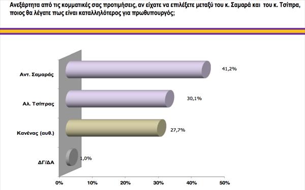 pro Σύμφωνα με την δημοσκόπηση, καταλληλότερος για πρωθυπουργός είναι ο Αντώνης Σαμαράς 41,2%, ενώ ακολουθούν: Αλέξης Τσίπρας 30,1%, κανένας 27,7%, δεν ξέρω 1,0 %.