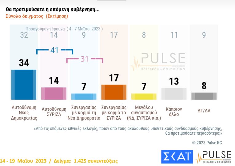 Στην ερώτηση τι θα προτιμούσαν για την επόμενη κυβέρνηση οι πολίτες απαντούν αυτοδυναμία της ΝΔ σε ποσοστό 34%. Το 14% θέλει αυτοδύναμη κυβέρνηση ΣΥΡΙΖΑ. Το 7% απαντά ότι προτιμάει κυβέρνηση συνεργασίας με κορμό την ΝΔ και το 17% κυβέρνηση συνεργασίας με κορμό τον ΣΥΡΙΖΑ.