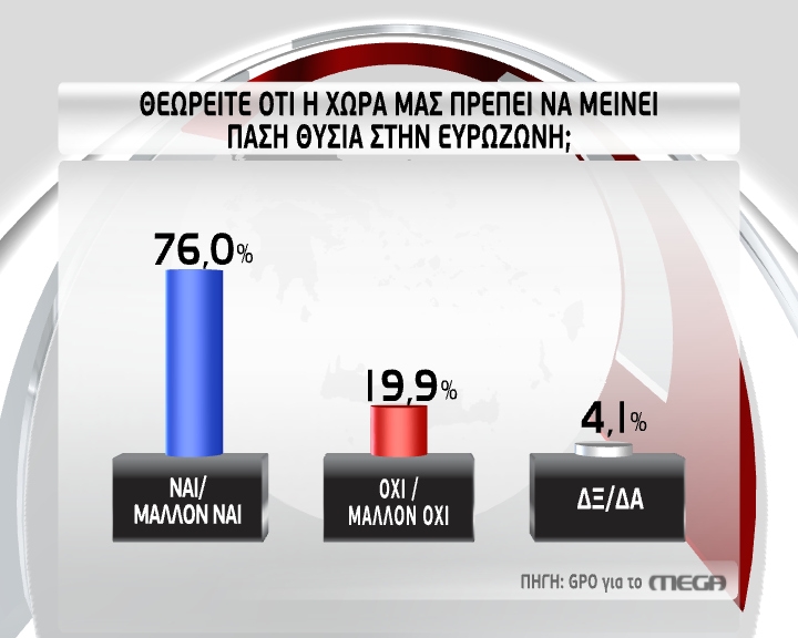 Θετικά απάντησε το 76% στο ερώτημα αν η χώρα μας πρέπει να μείνει πάση θυσία στην Ευρώζώνη και αρνητικά απάντησε το 19,9%.