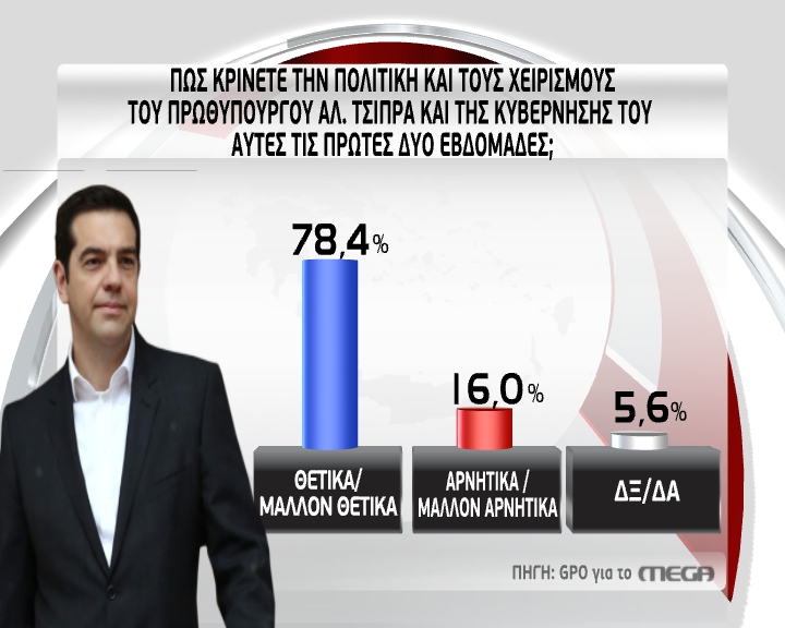 Στο ερώτημα «πως κρίνετε την πολιτική και τους χειρισμούς του Πρωθυπουργού, Αλέξη Τσίπρα και της κυβέρνησής του αυτές τις πρώτες δύο εβδομάδες, θετικά απάντησε το 78,4% και αρνητικά το 16%.