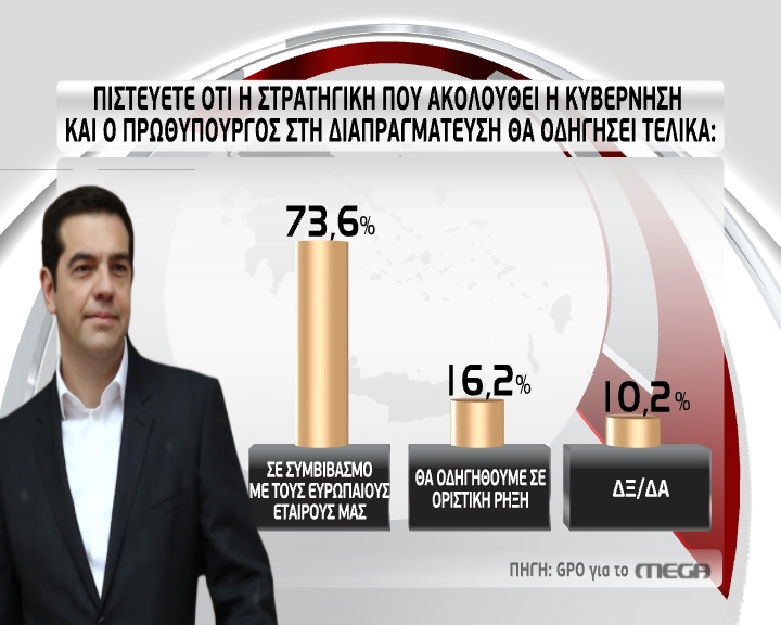 Παράλληλα, το 73,6% απάντησε ότι η στρατηγική που ακολουθεί η κυβέρνηση και ο Πρωθυπουργός στη διαπραγμάτευση θα οδηγήσει τελικά σε συμβιβασμό με τους ευρωπαίους εταίρους μας και το 16,2% απάντησε ότι θα οδηγηθούμε σε οριστική ρήξη.