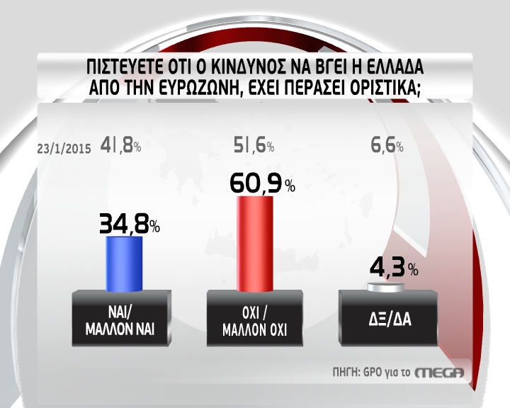 Στο ερώτημα αν «πιστεύετε ότι ο κίνδυνος να βγει η Ελλάδα από την Ευρωζώνη, έχει περάσει οριστικά», το 34,8% απάντησε θετικά και το 60,9% αρνητικά.