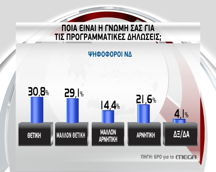 Το 30,8% των ψηφοφόρων της Νέας Δημοκρατίας έχει θετική γνώμη για τις προγραμματικές δηλώσεις, το 29,1%, «μάλλον θετική», το 14,4 «μάλλον αρνητική» και «αρνητική» το 21,6%.