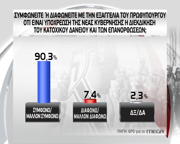 Στο ερώτημα συμφωνείτε ή διαφωνείτε με την εξαγγελία του Πρωθυπουργού ότι είναι υποχρέωση της νέας κυβέρνησης η διεκδίκηση του κατοχικού δανείου και των επανορθώσεων, το 90,3% απάντησε θετικά και το 7,4% αρνητικά.
