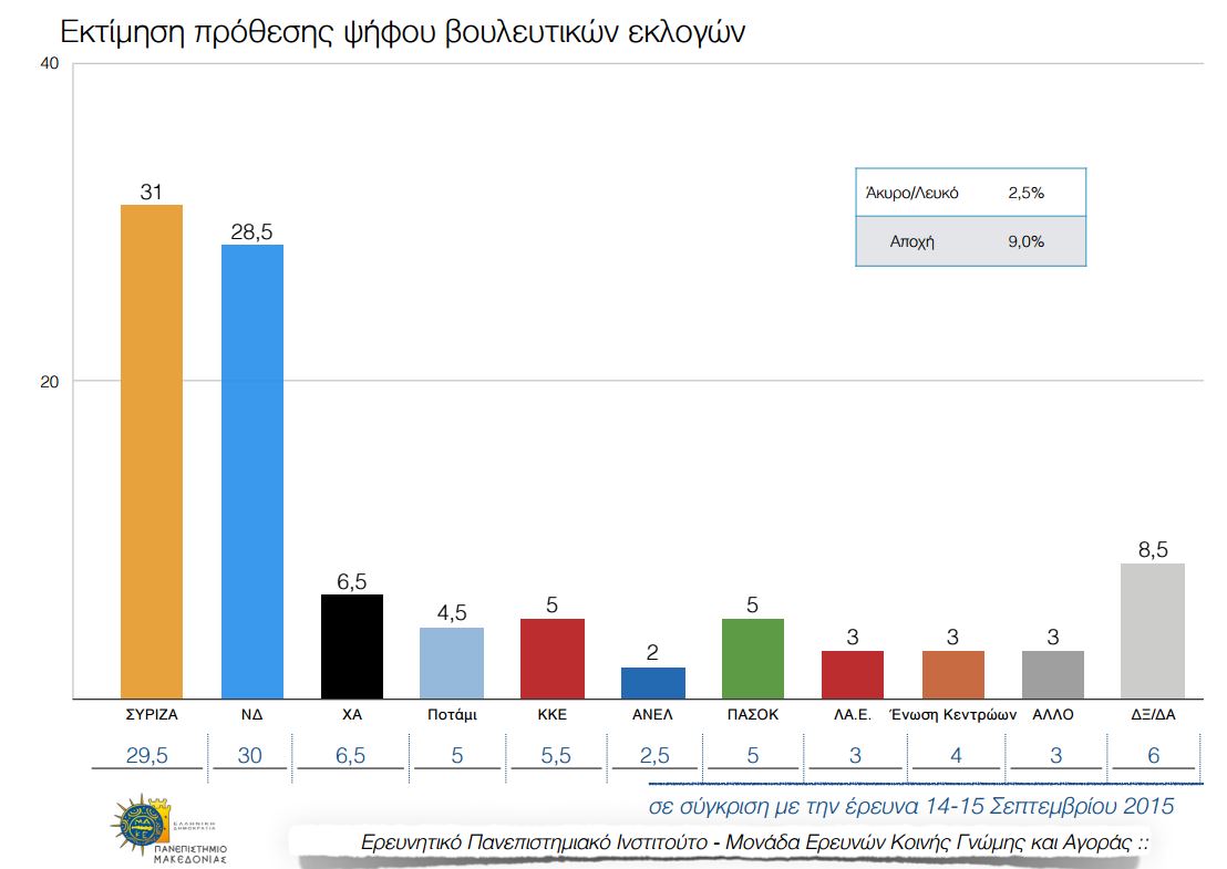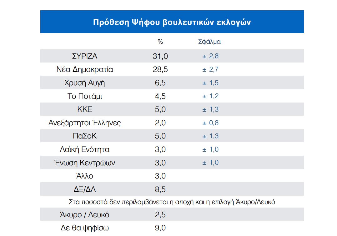 Συγκεκριμένα, σύμφωνα με την εκτίμηση πρόθεσης ψήφου ο ΣΥΡΙΖΑ συγκεντρώνει 31%, η ΝΔ 28,5%, η Χρυσή Αυγή 6,5%, το ΚΚΕ και η Δημοκρατική Συμπαράταξη ΠΑΣΟΚ-ΔΗΜΑΡ 5%, το Ποτάμι 4,5%, η ΛΑΕ και η Ένωση Κεντρώων 3%. Οι ΑΝΕΛ έχουν ποσοστό 2%, ενώ άλλο κόμμα δηλώνει ότι θα ψηφίσει το 3% και ΔΞ/ΔΑ 8,5%. Η αποχή φτάνει το 9%, ενώ το άκυρο/λευκό το 2,5%.