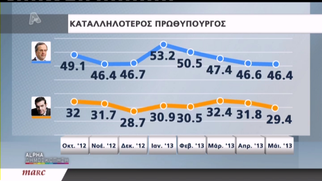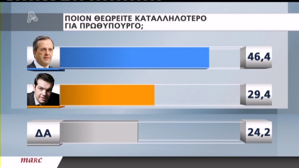 Καταλληλότερος πρωθυπουργός θεωρείται ο Αντώνης Σαμαράς με ποσοστό 46,4% έναντι του Αλέξη Τσίπρα που συγκεντρώνει 29,4%.