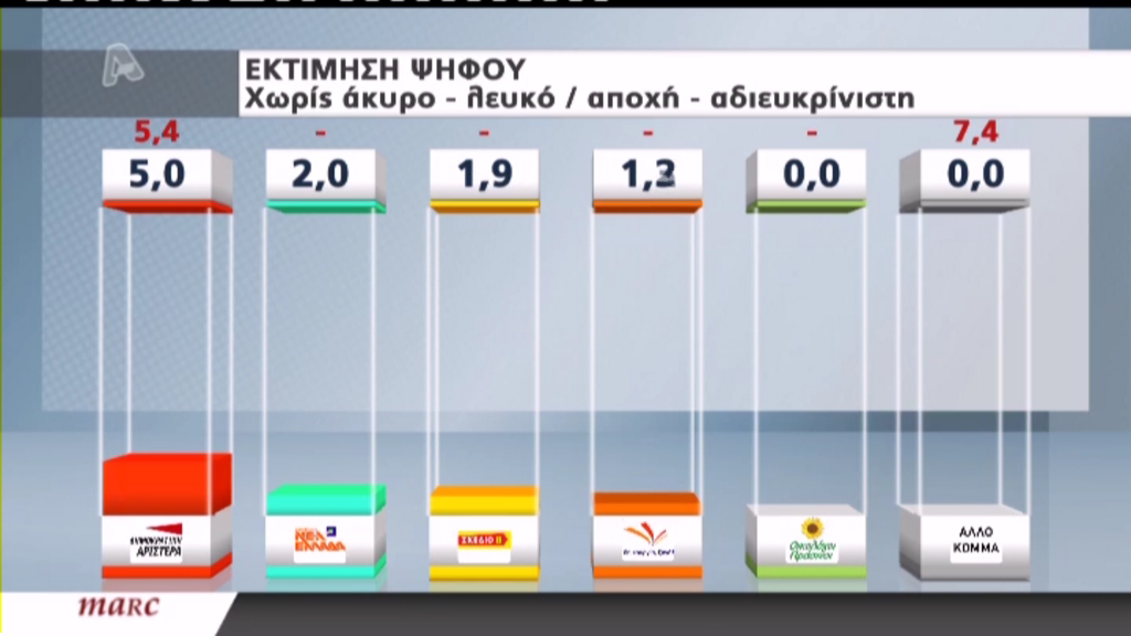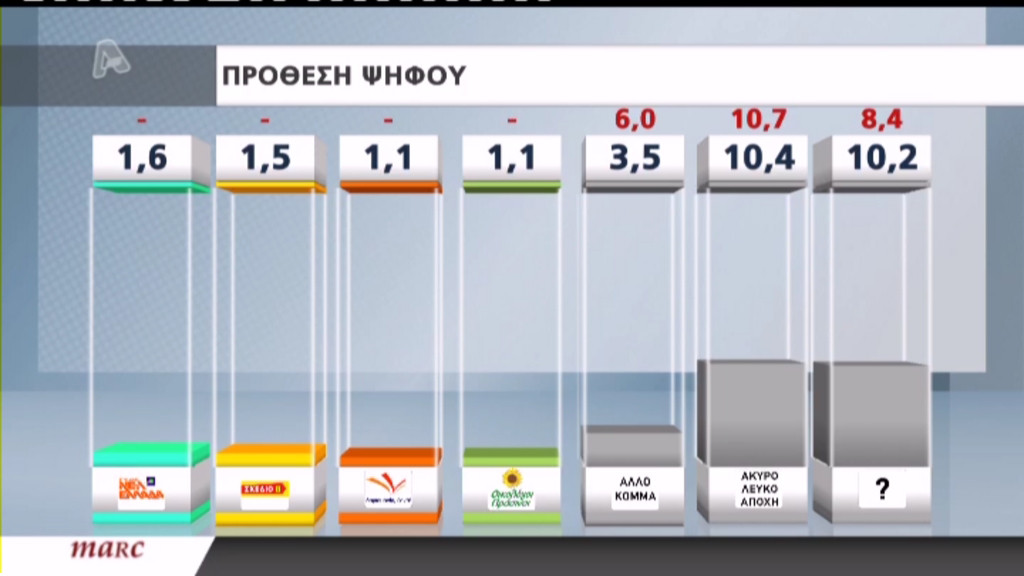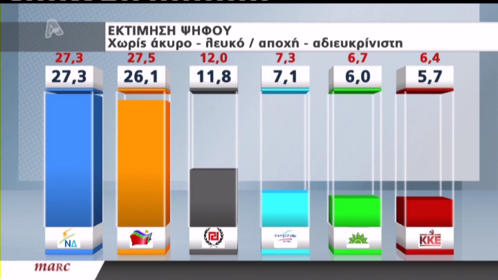Στην εκτίμηση ψήφου τα κόμματα συγκέντρωσαν: ΝΔ 27,3%, ΣΥΡΙΖΑ 26,1%, Χρυσή Αυγή 11,8%, Ανεξάρτητοι Έλληνες 7,1%, ΠΑΣΟΚ 6%, ΚΚΕ 5,7%, ΔΗΜΑΡ 5% και Νέα Ελλάδα 2%, Σχέδιο Β’ 1,9%.