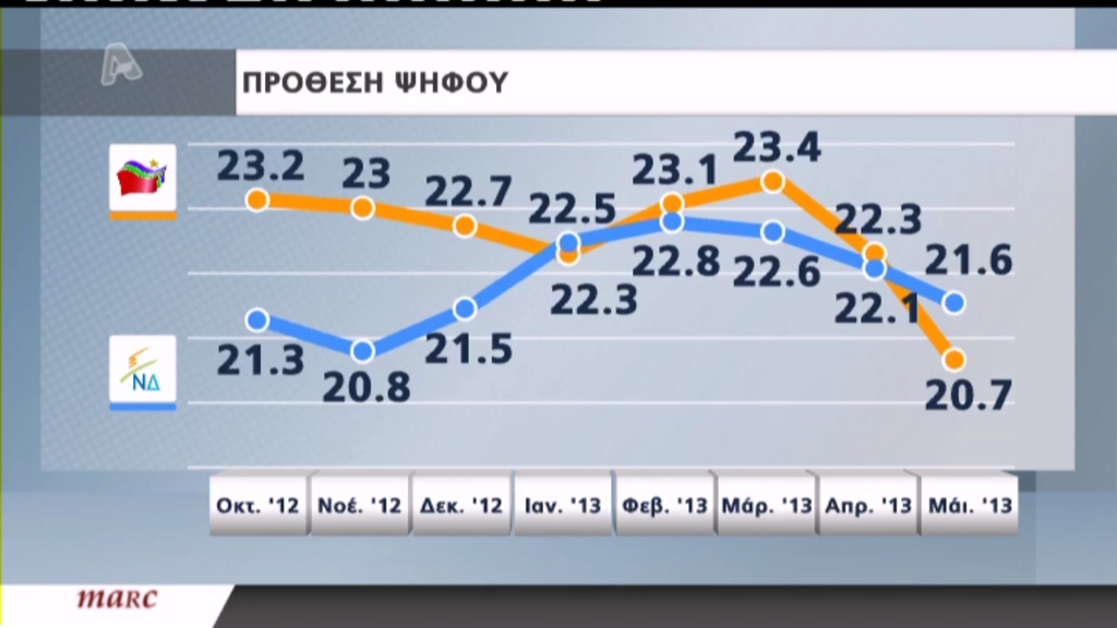 Η ΝΔ στην πρόθεση ψήφου συγκεντρώνει 21,6%, ο ΣΥΡΙΖΑ 20,7%, η Χρυσή Αυγή 9,4%, οι Ανεξάρτητοι Έλληνες 5,6%, το ΠΑΣΟΚ 4,8%, το ΚΚΕ 4,5%, η ΔΗΜΑΡ 4%, ενώ στη δημοσκόπηση κατεγράφησαν και η «Νέα Ελπίδα» του Ανδρέα Λοβέρδου που συγκέντρωσε 1,6% και το «Σχέδιο Β’» του Αλέκου Αλαβάνου με 1,5%.
