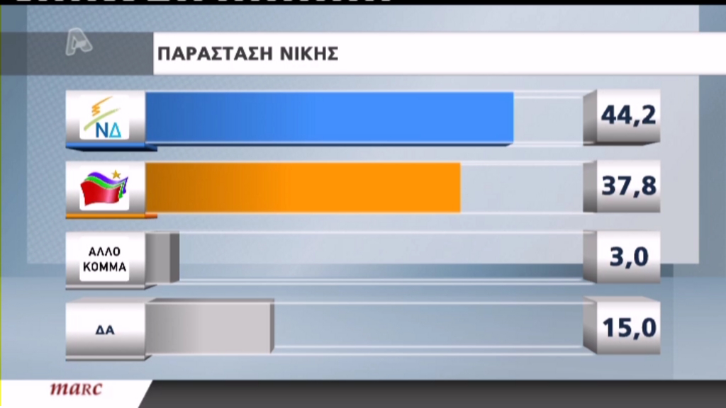 Στην παράσταση νίκης η ΝΔ φτάνει το 44,2%, ενώ ο ΣΥΡΙΖΑ συγκεντρώνει 37,8%.