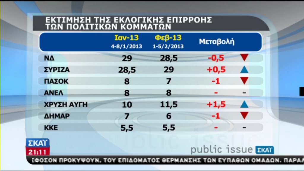 “Nτέρμπι” δείχνει το πολιτικό βαρόμετρο της Public Issue για τον ΣΚΑΪ και την Καθημερινή για τον Φεβρουάριο, καθώς στην εκτίμηση εκλογικής επιρροής ο ΣΥΡΙΖΑ προηγείται με 29% έναντι 28,5% της ΝΔ.