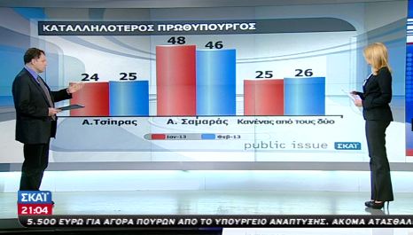 Καταλληλότερος πρωθυπουργός αναδεικνύεται ο Αντώνης Σαμαράς με 46%, όμως το ποσοστό του είναι ελαφρώς μειωμένο σε σχέση με τον Ιανουάριο (-2). Το ποσοστό του Αλέξη Τσίπρα, αντίθετα, ανέβηκε κατά μία μονάδα φτάνοντας το 25%.