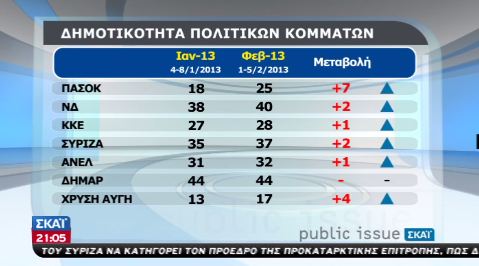 Ανοδικά κινούνται και τα ποσοστά δημοτικότητας των πολιτικών κομμάτων, με τη μεγαλύτερη μεταβολή να την εμφανίζει το ΠΑΣΟΚ.