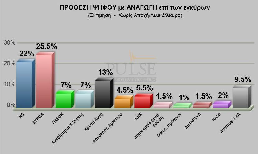 Σε ότι αφορά την πρόθεση ψήφου με αναγωγή επί των εγκύρων ο ΣΥΡΙΖΑ διευρύνει το προβάδισμα του καθώς συγκεντρώνει 25,5% έναντι 22% της ΝΔ.