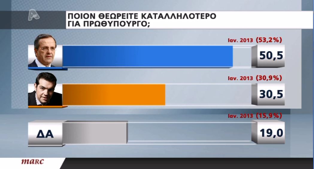Καταλληλότερος πρωθυπουργός θεωρείται ο Α. Σαμαράς με ποσοστό 50,5% έναντι του Αλέξη Τσίπρα, που συγκεντρώνει 30,5%.