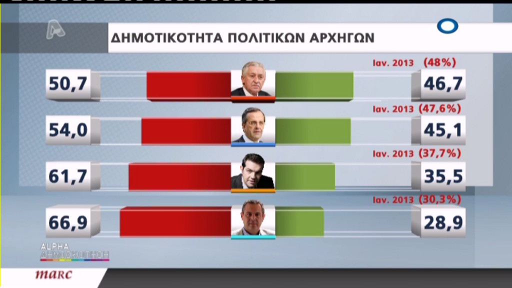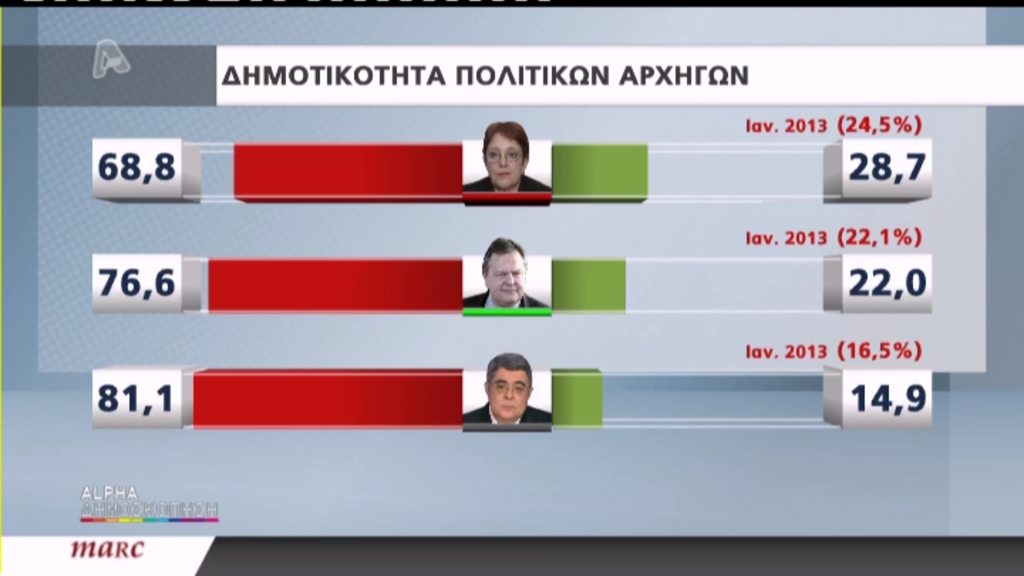 Ενώ η δημοτικότητα των πολιτικών αρχηγών διαμορφώθηκε ως εξής: