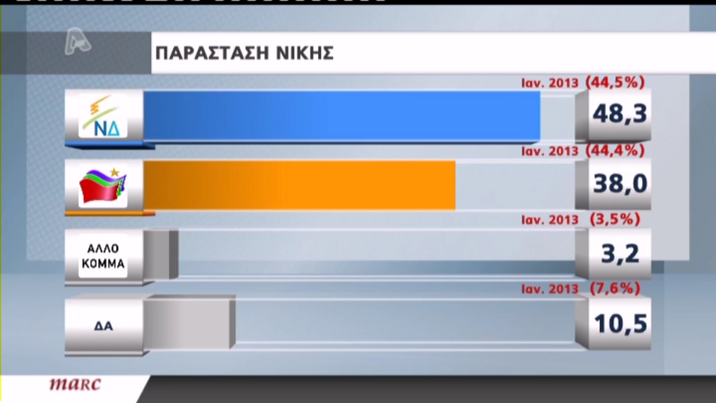 Στην παράσταση νίκης η ΝΔ φτάνει το 48,3% από 44,5% τον Ιανουάριο του 2013, ενώ ο ΣΥΡΙΖΑ συγκεντρώνει 38% έναντι 44,4% για το ίδιο διάστημα.