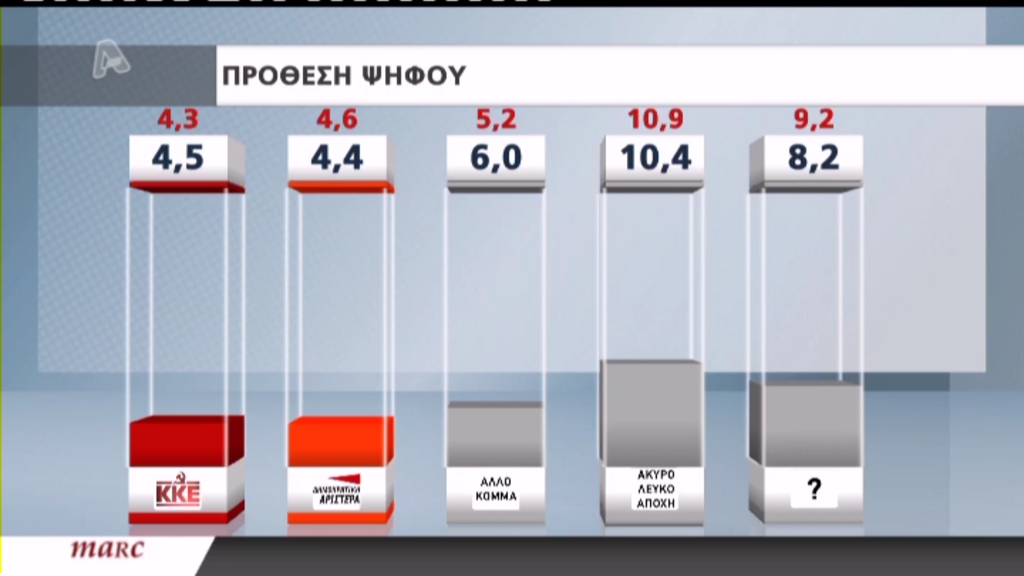 Ενώ στην εκτίμηση ψήφου τα κόμματα συγκέντρωσαν: ΣΥΡΙΖΑ 28,3%, ΝΔ 28,%, Χρυσή Αυγή 12,3%, ΠΑΣΟΚ 6,6%, Ανεξάρτητοι Έλληνες 6,6%, ΚΚΕ 5,5% και ΔΗΜΑΡ 5,4%.