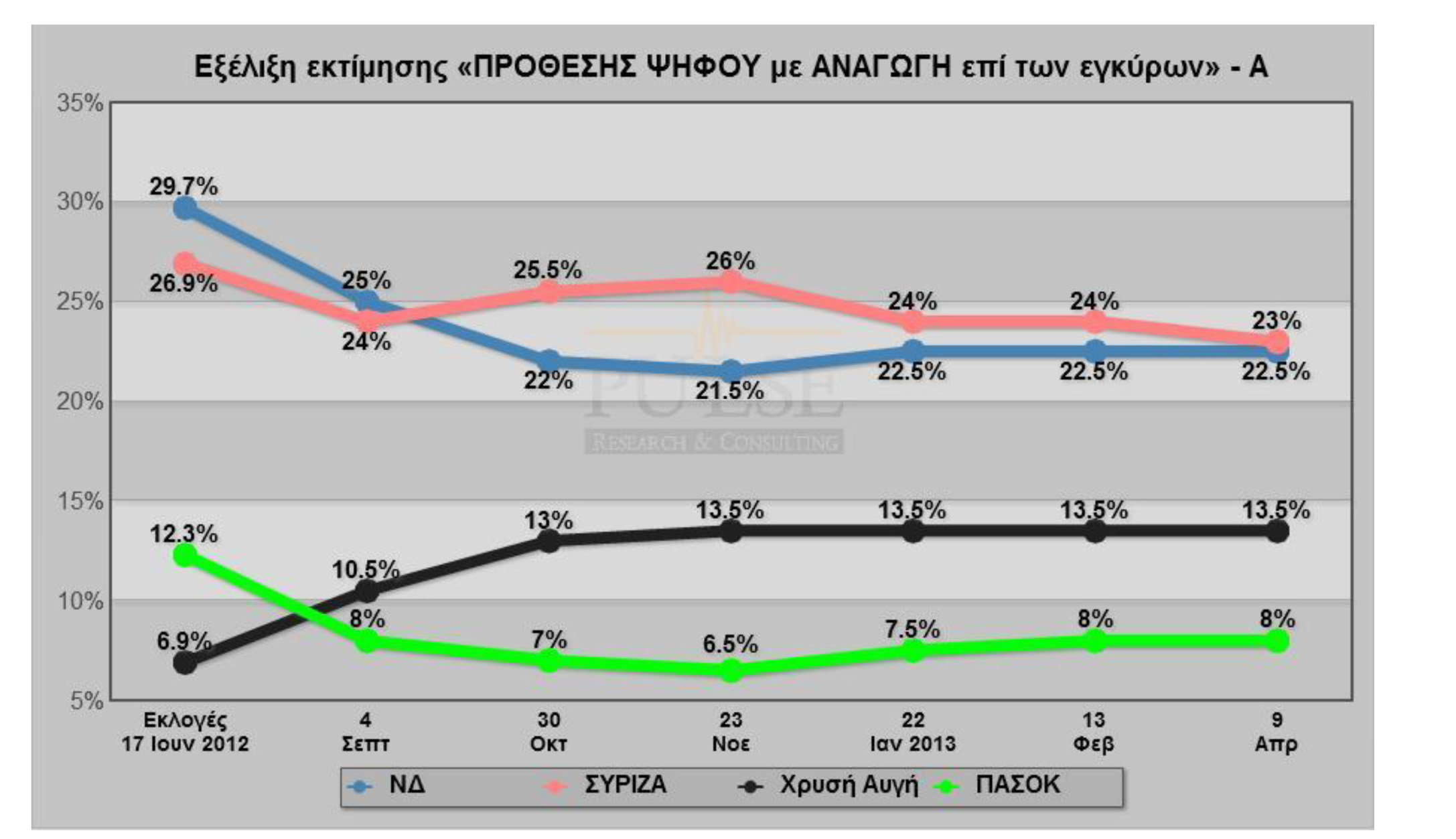 Ενδιαφέρον παρουσιάζει και η εξέλιξη εκτίμησης της πρόθεσης ψήφου (με αναγωγή επί των εγκύρων) από τις εκλογές της 17ης Ιουνίου μέχρι σήμερα.