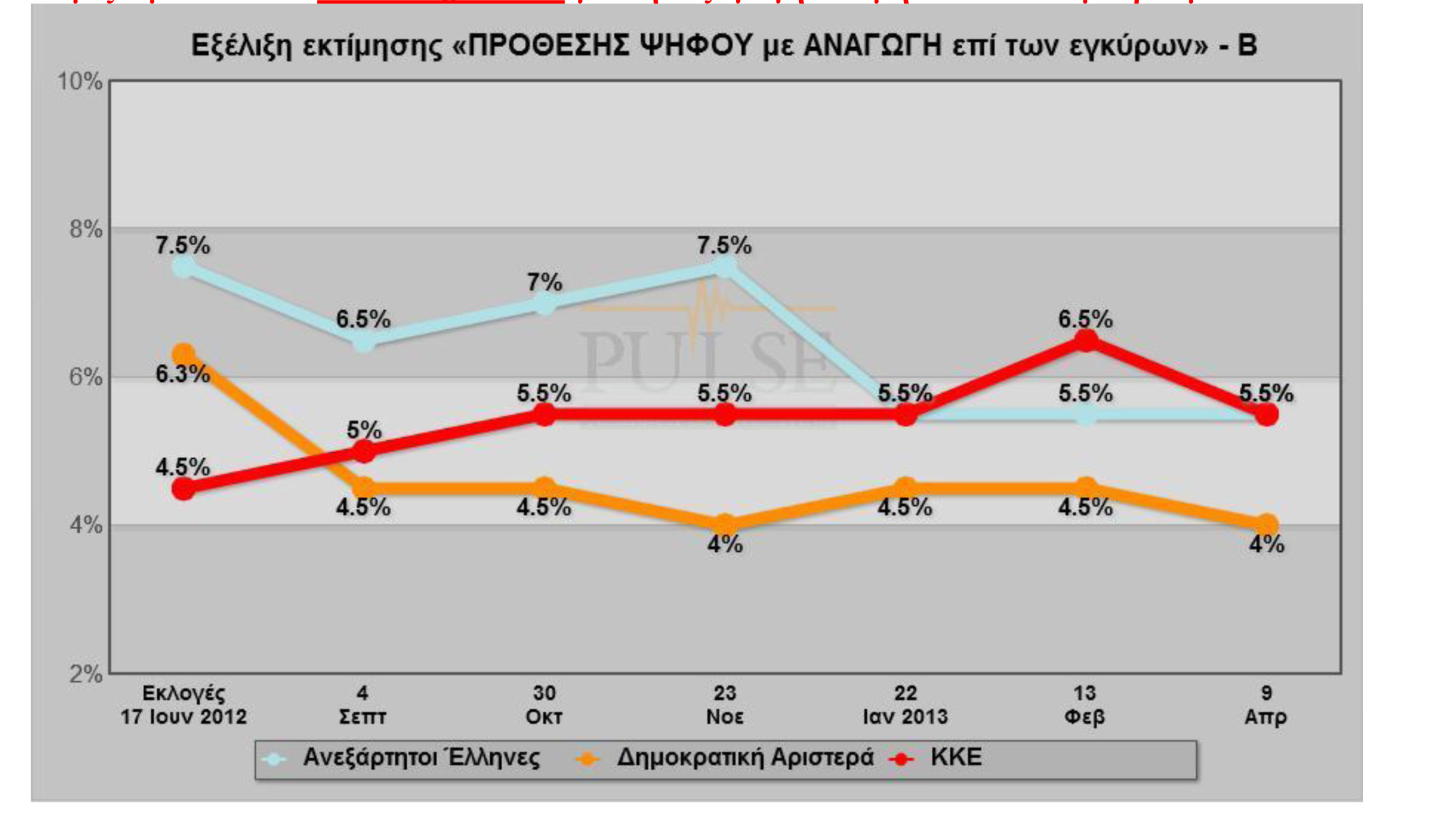 Ακολουθεί το ΠΑΣΟΚ με 7%, 5% συγκεντρώνουν τόσο οι Ανεξάρτητοι Έλληνες όσο και το ΚΚΕ, ενώ το ποσοστό της ΔΗΜΑΡ είναι 3,5%. Χαρακτηριστικό είναι ότι ένα 5,5% επιλέγει άλλο κόμμα και το ποσοστό των αναποφάσιστων/Δ.Α. αγγίζει το 10%.