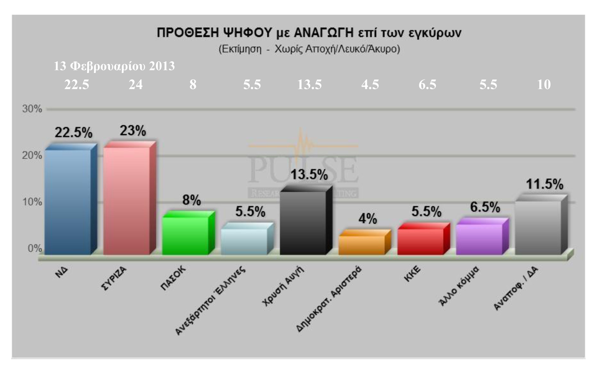Ανάλογα είναι τα ποσοστά στην πρόθεση ψήφου με αναγωγή επί των εγκύρων, με τον ΣΥΡΙΖΑ να προηγείται με 23% έναντι 22,5% της ΝΔ.