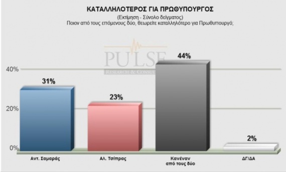 Στην καταλληλότητα για την πρωθυπουργία, ο Αντώνης Σαμαράς προηγείται κατά 8% του Αλέξη Τσίπρα. Συγκεκριμένα, το 31% θεωρεί τον κ. Σαμαρά καταλληλότερο για πρωθυπουργό, το 23% τον κ. Τσίπρα, ενώ το 44% απαντά κανένας από τους δύο.